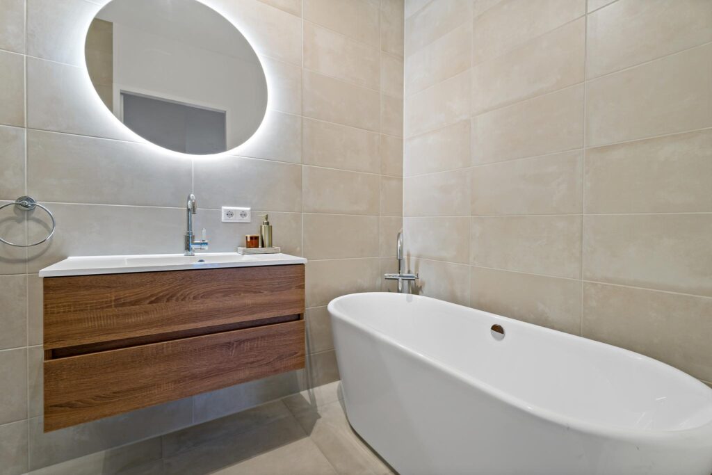 – Grote tegels in badkamers, badkamermeubel, spiegel, glazen douchewand, regendouche en in enkele gevallen een vrijstaand ligbad