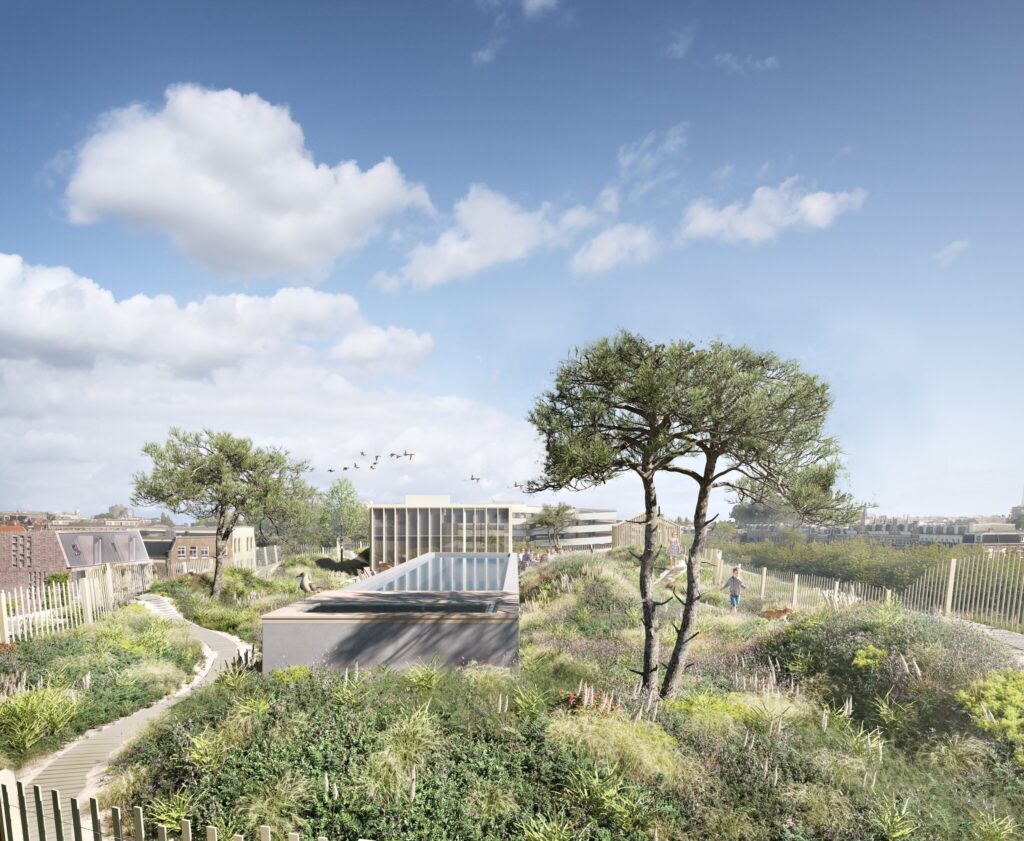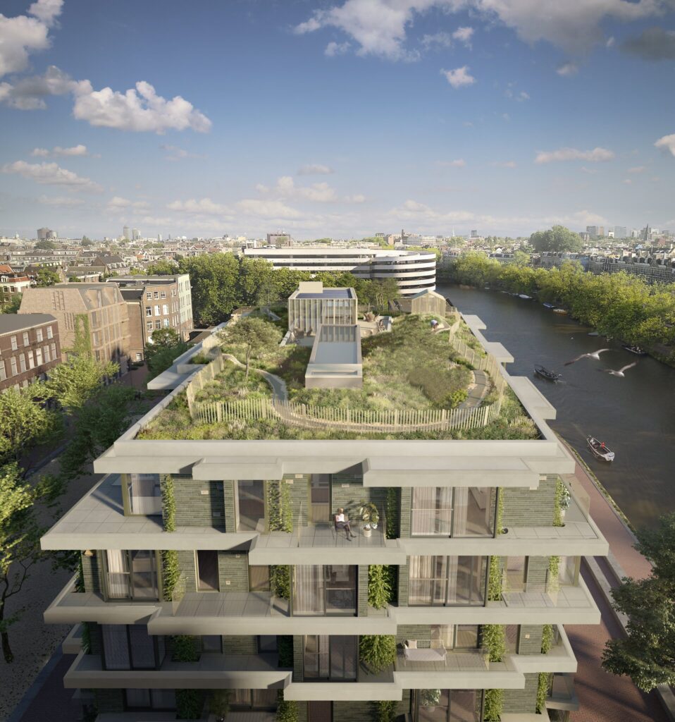 Het appartementengebouw aan de Singelgracht bestaat uit 35 appartementen die allemaal anders zijn. De buitenruimtes zijn prachtig ontworpen, zodat iedereen echt een eigen plek in de zon kan opzoeken. Op het dak wordt, voor alle bewoners, een spectaculair duinlandschap aangelegd met een buitenzwembad en een strandhuis voor feestjes, gezellige etentjes of gezamenlijke activiteiten zoals teken- of schilderworkshops. Hier zit je prinsheerlijk met je voeten in het zand, uitkijkend over de stad, te midden van helmgras en duinroos… compleet met rondzoemende bijen en overvliegende zeemeeuwen.