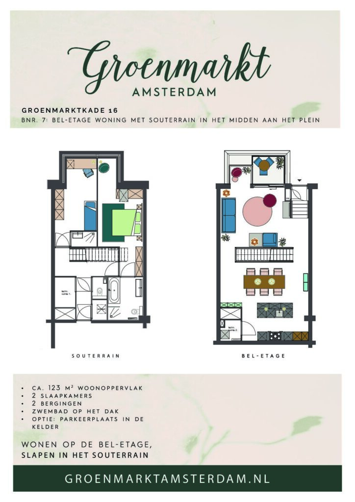Dit dubbellaags benedenhuis (ca. 123 m²) is gelegen op de beletage en het souterrain aan de pleinzijde. De beletage heeft een grote living met aansluiting voor de keuken met eiland. Aangrenzend aan de living is er via een schuifpui toegang tot de buitenruimte, deze biedt een geweldig uitzicht over het gezellige plein.