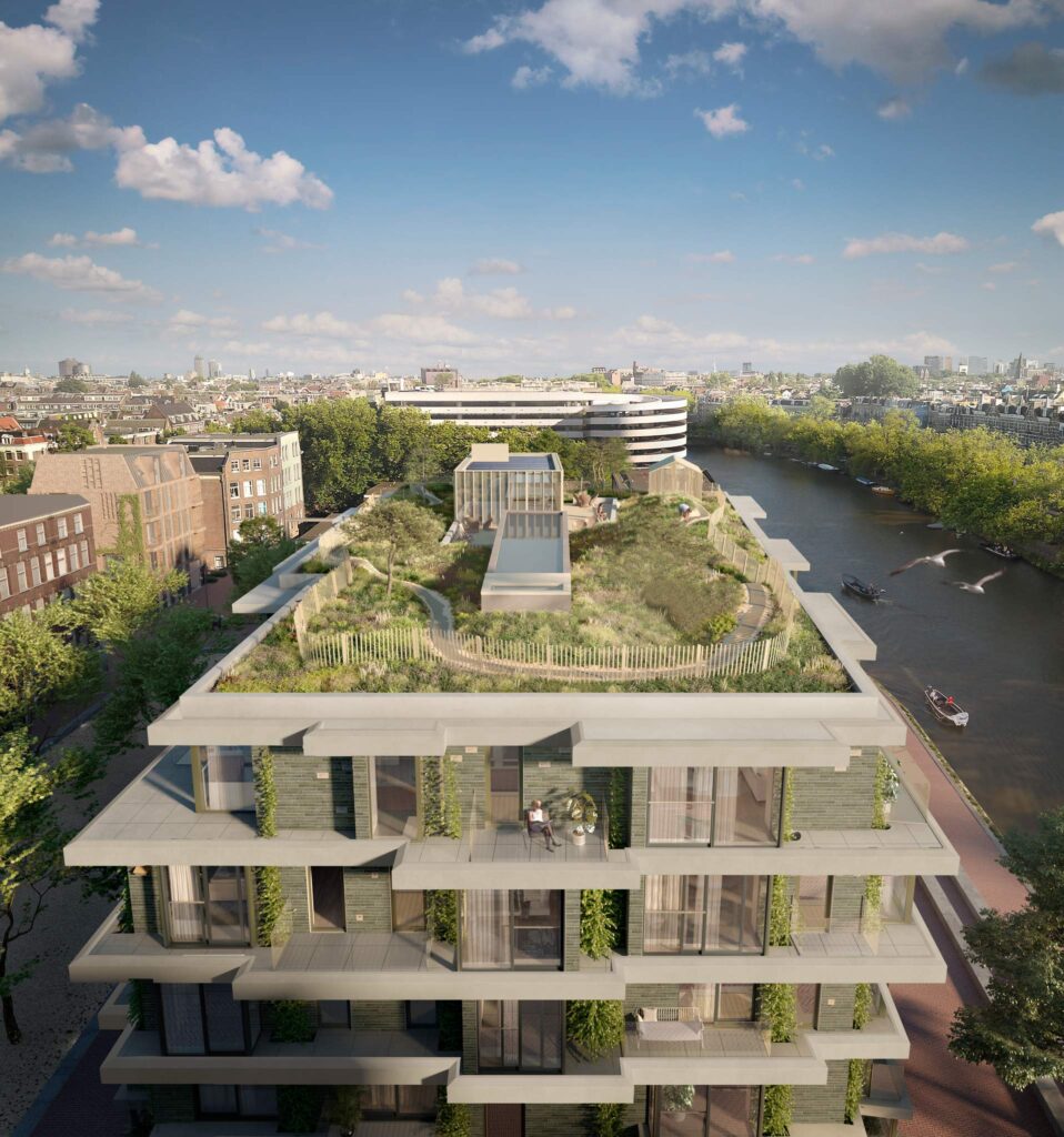 Het appartementengebouw aan de Singelgracht bestaat uit 35 appartementen die allemaal anders zijn. De buitenruimtes zijn prachtig ontworpen, zodat iedereen echt een eigen plek in de zon kan opzoeken. Op het dak is, voor alle bewoners, een spectaculair duinlandschap aangelegd met een buitenzwembad en een strandhuis voor gezellige etentjes of gezamenlijke activiteiten zoals teken- of schilderworkshops. Hier zit je prinsheerlijk met je voeten in het zand, uitkijkend over de stad, te midden van helmgras en duinroos, compleet met rondzoemende bijen en overvliegende zeemeeuwen.