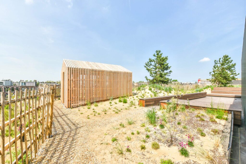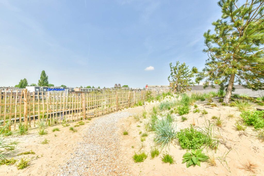 Wonen alsof je altijd op vakantie bent, met gevels die gemaakt zijn om te begroeien en een duinlandschap met zwembad op het dak van het gebouw. Waaien op het dak doet het altijd wel een beetje, Amsterdam hoef je zo niet meer uit als je naar het strand wilt. Vanuit het langgerekte zwembad heb je prachtig uitzicht over de stad als je er een baantje trekt. Het tuinhuis is een ontmoetingsplek voor bewoners en er is een kruidentuin.