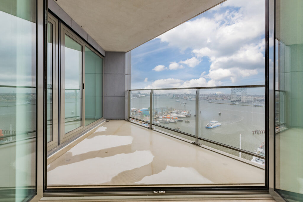 – aan de zonkant van het IJ met uitzicht over het water en de stad
