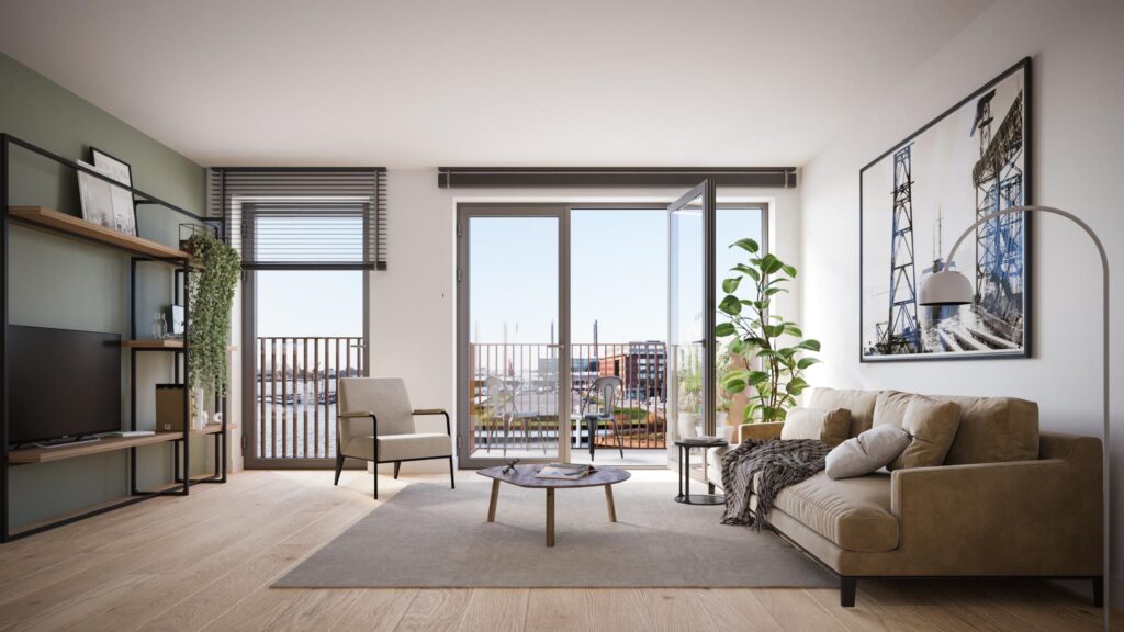 NDSM South Dock offers space for more than two hundred flats. From two-room flats of around 62 m2 to five-room flats of around 129 m2. The large windows bring in daylight, while the outdoor spaces – a terrace or balcony – give a sense of space. The flats are cleverly arranged, making best use of the available space. Finishing is luxurious and done with great attention. The bathroom and kitchen are fully equipped.