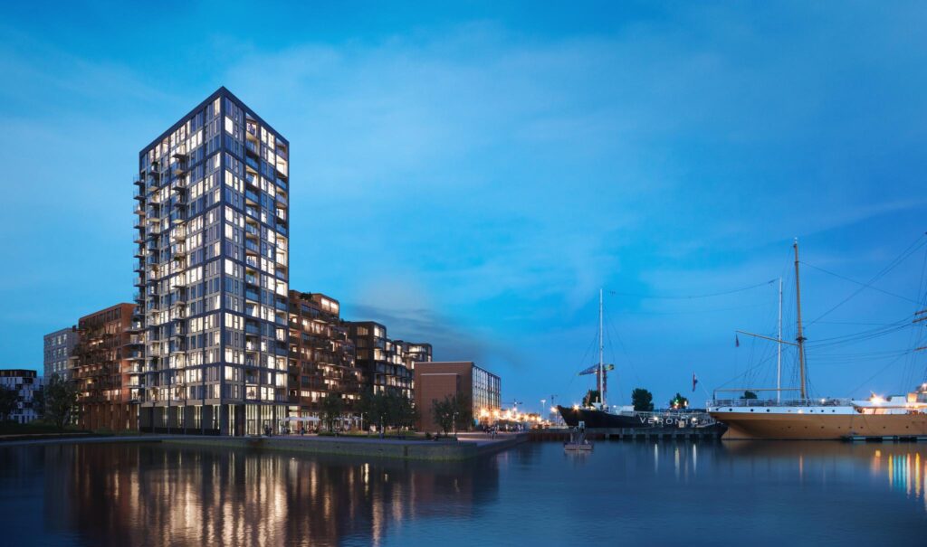 NDSM South Dock is located right on the water and consists of several buildings. The 18-storey tower and large windows give NDSM South Dock a unique appearance. Metropolitan and open, robust and accessible. The ground floor of the tower is reserved for commercial activities: offices, shops and catering establishments. Above it will be flats. NDSM South Dock also stands for convenience. There is an underground car park and thanks to the bringme service in the lobby, you will never miss a parcel again.
