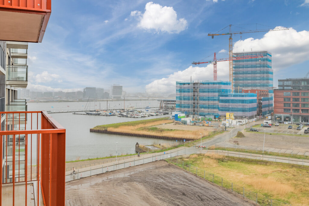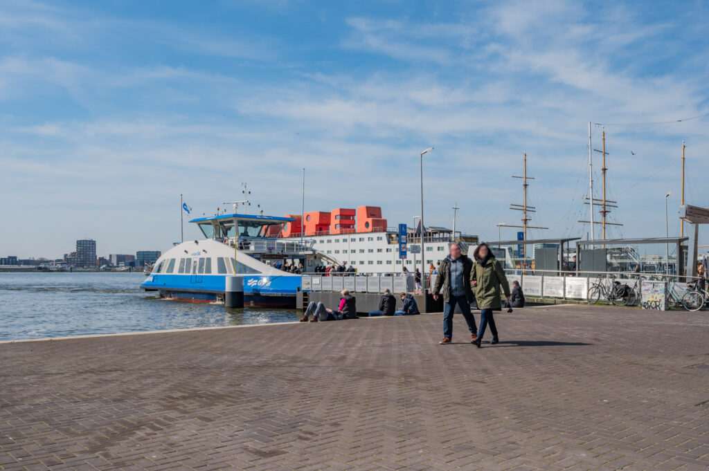– aan de zonkant van het IJ met uitzicht over het water en de stad