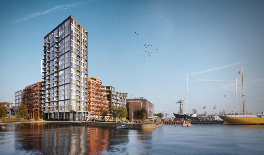 NDSM South Dock is located right on the water and consists of several buildings. The 18-storey tower and large windows give NDSM South Dock a unique appearance. Metropolitan and open, robust and accessible. The ground floor of the tower is reserved for commercial activities: offices, shops and catering establishments. Above it will be flats. NDSM South Dock also stands for convenience. There is an underground car park and thanks to the bringme service in the lobby, you will never miss a parcel again.