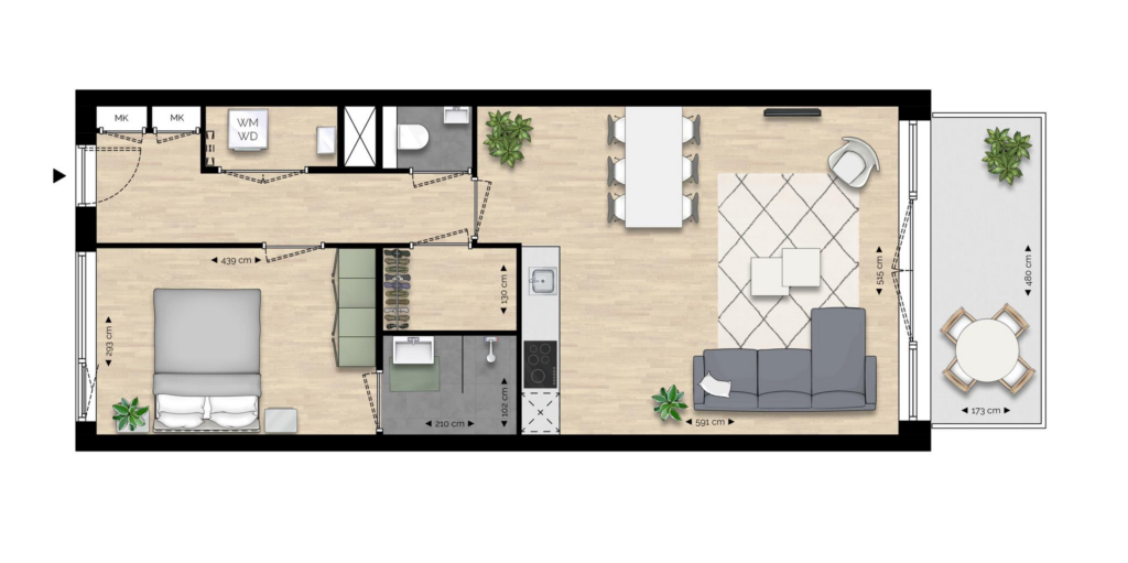 NDSM South Dock offers space for more than two hundred flats. From two-room flats of around 62 m2 to five-room flats of around 129 m2. The large windows bring in daylight, while the outdoor spaces – a terrace or balcony – give a sense of space. The flats are cleverly arranged, making best use of the available space. Finishing is luxurious and done with great attention. The bathroom and kitchen are fully equipped.
