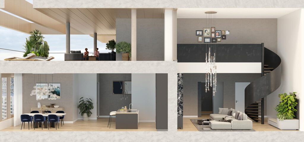 Er zijn vier penthouses op de 30e verdieping, één op elke hoek van het gebouw. Bij binnenkomst valt meteen de dubbele verdiepingshoogte op. Wauw! De enorme ramen in de woonkamer geven je echt een adembenemend uitzicht over Amsterdam! Via de designtrap kun je nog een stap hoger. Vanuit de loft op de 31e verdieping stap je zo het enorme privéterras op. Het terras is gedeeltelijk overdekt, dus je kunt er 365 dagen per jaar van genieten.