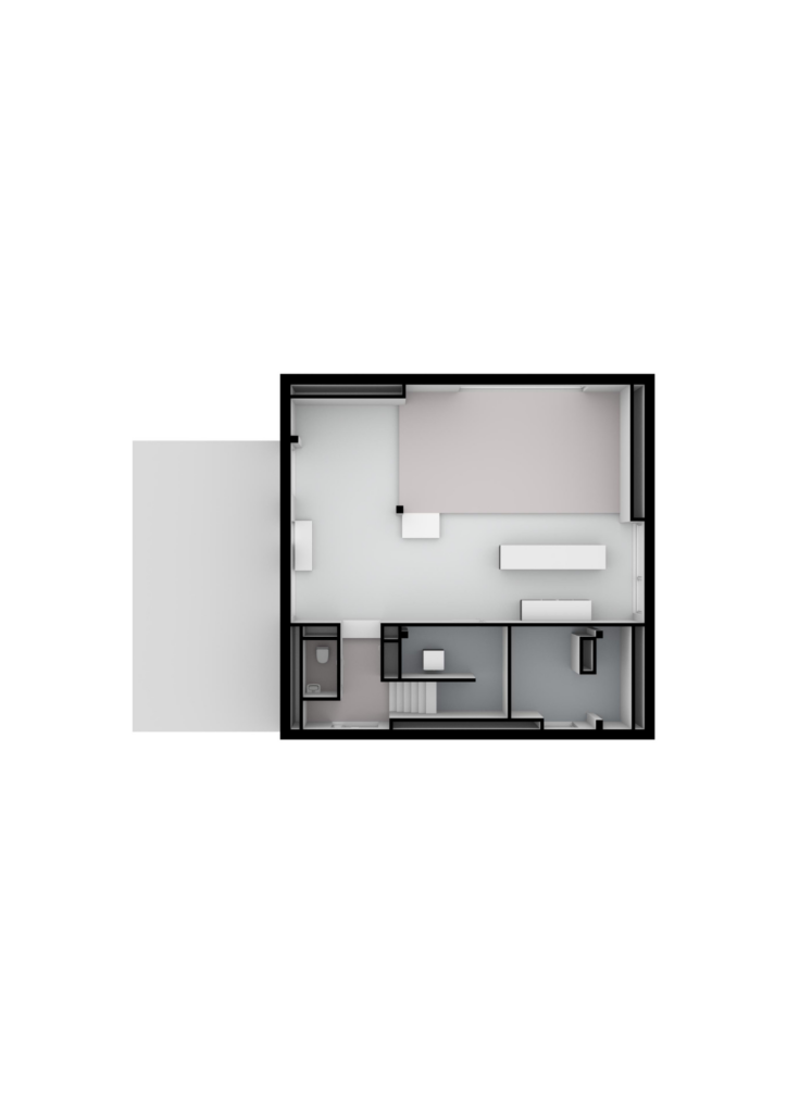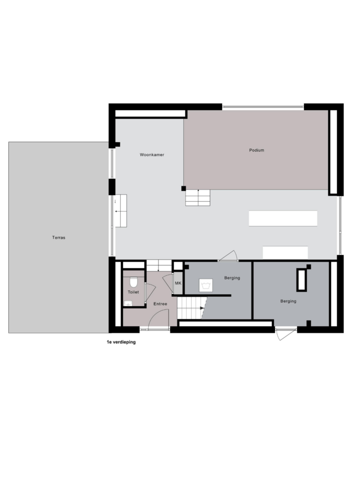 Entree; hal met wc, trap naar boven, grote ruime living met een podium, een lager gelegen keuken en een aparte study / werkkamer die toegang biedt tot het privé terras. Tot slot is er een bergruimte met o.a. wasmachineaansluiting.
