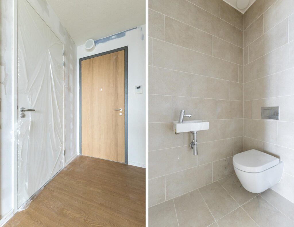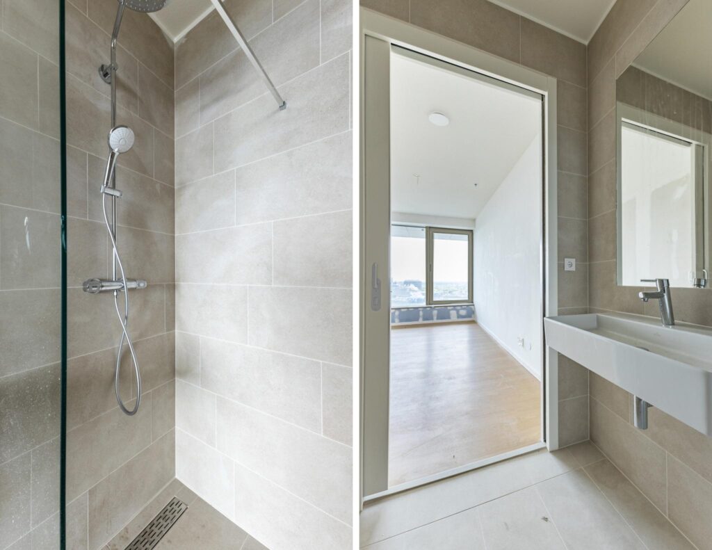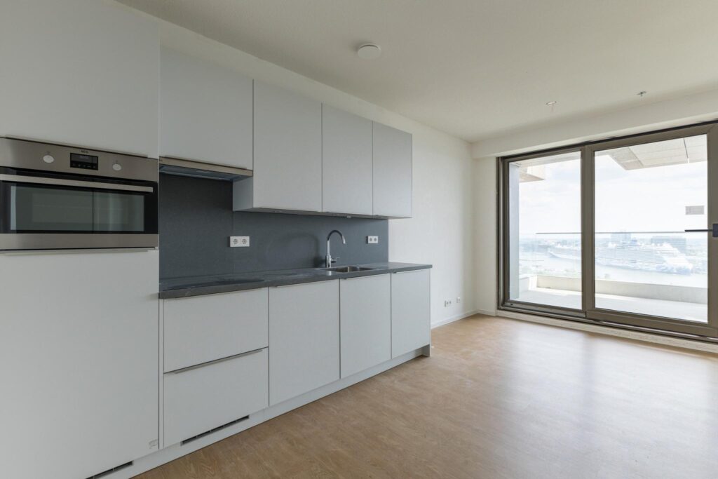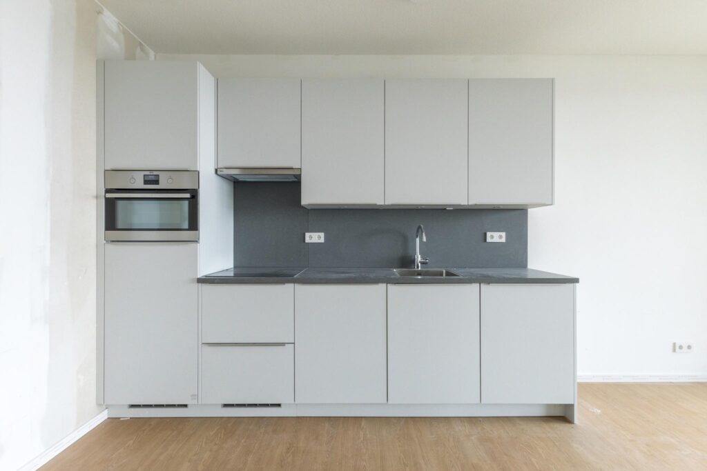 Alle appartementen worden volledig afgewerkt opgeleverd. De grijs/witte Bruynzeel keuken heeft een natuurstenen composiet werkblad en alle benodigde apparatuur.