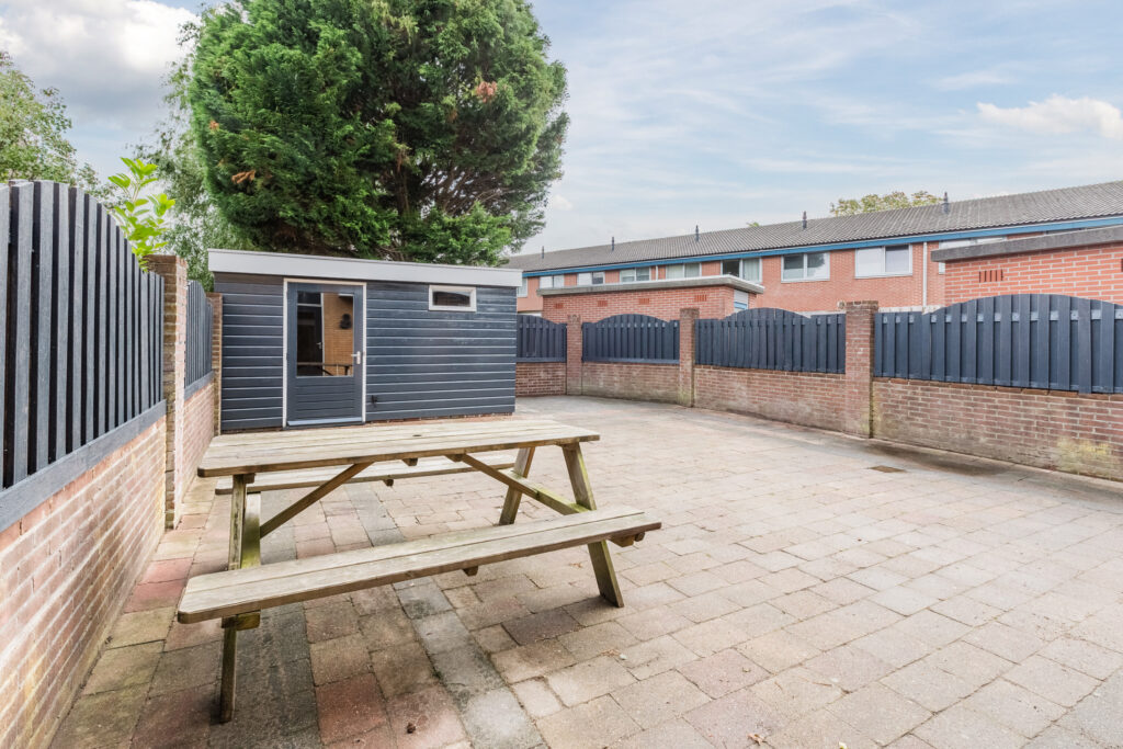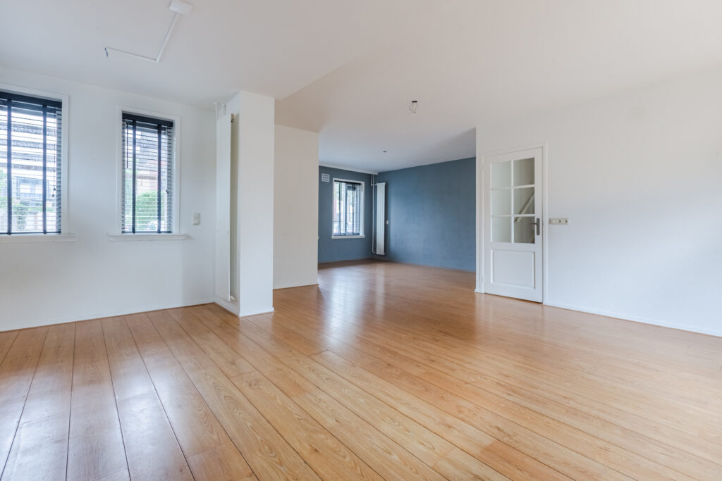You enter the hallway with the meter cupboard. Next, we enter the extended living room. The sitting area is located at the front of the house and offers an unobstructed view of the quiet street. The house has plenty of natural light thanks to the many windows. The kitchen is open and L-shaped, equipped with an induction hob, refrigerator, combi-oven and dishwasher. There is enough space for a cosy dining area where you can enjoy many evenings with friends and family. Through the French doors, you can access the spacious northeast-facing garden. The garden is fully tiled and therefore maintenance-free and has a separate wooden shed and a gate so you can enter from the back. Back in the house, in addition to the French doors, we can also enter through a separate door, which leads to a hall with access to the toilet with washbasin, a stair cupboard, the staircase to the first floor and access to the living room.