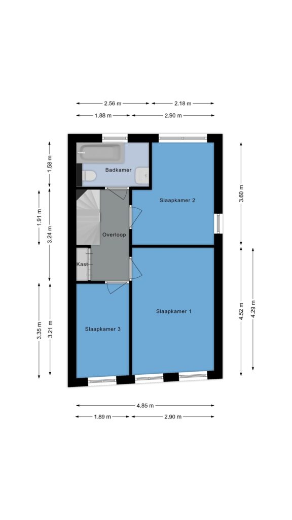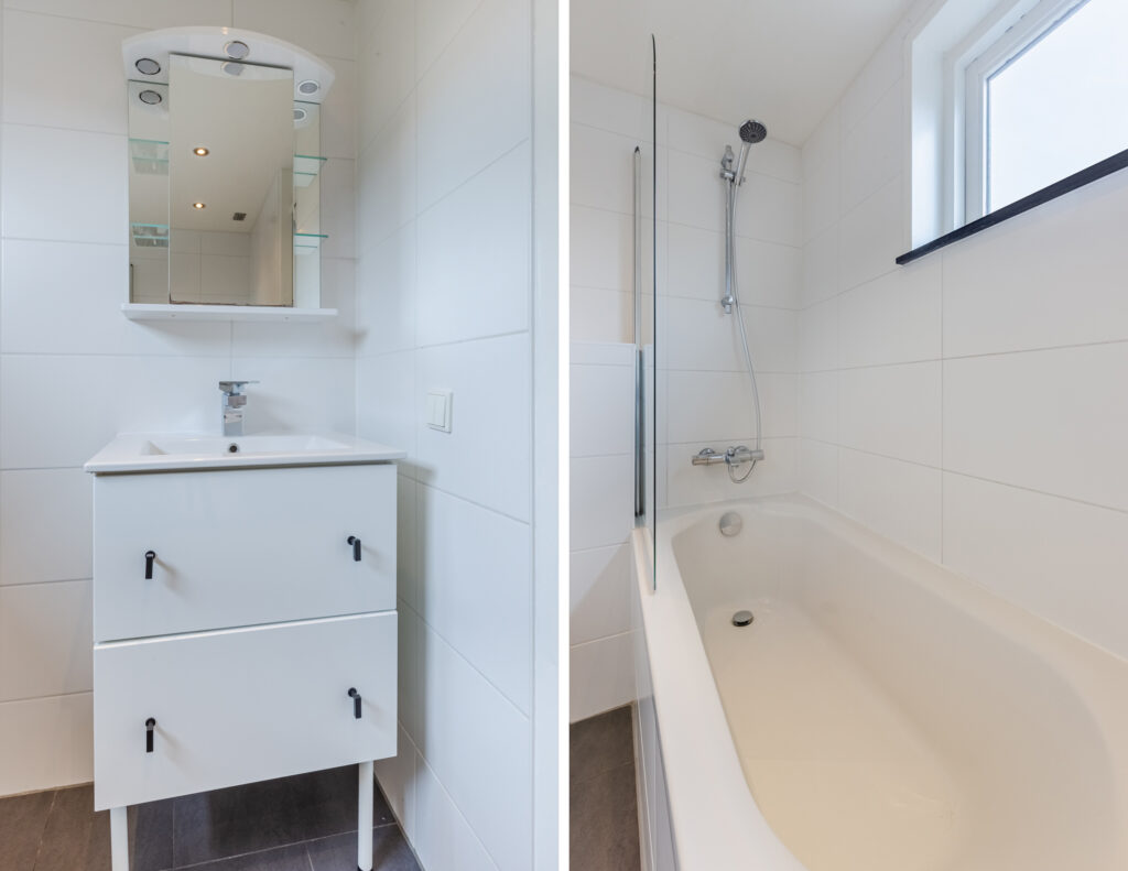 Op de eerste verdieping heb je de beschikking over 3 slaapkamers, alle drie goed van formaat. De badkamer is voorzien van een wastafel met meubel, toilet en ligbad met douche-mogelijkheid.