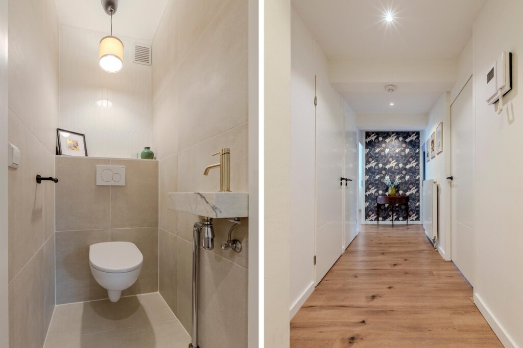 entree/hal die toegang biedt tot alle ruimten, hangend toilet met fontein. Aan de voorzijde bevindt zich de ruime woonkamer met grote raampartijen en toegang tot het zonnige terras op het westen. Luxe inbouwkeuken voorzien van kookschiereiland met diverse apparatuur te weten: inductiekookplaat met afzuiging, vaatwasser, dual-cook oven, magnetron, koel-/vriescombinatie en wijnklimaatkast. 2 ruime (slaap-) kamers waarvan 1 kamer met grote vaste kast en 1 kamer met bergkast voorzien van wasmachine- en drogeraansluiting. Tevens geeft deze kamer toegang tot de verrassende ruime achtertuin op het oosten, met zon in de ochtend en vroege middag. Luxe badkamer voorzien van inloopdouche, wastafel meubel met dubbele wasbakken en designradiator. De verdieping is voorzien van een laminaatvloer.