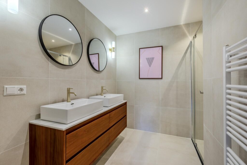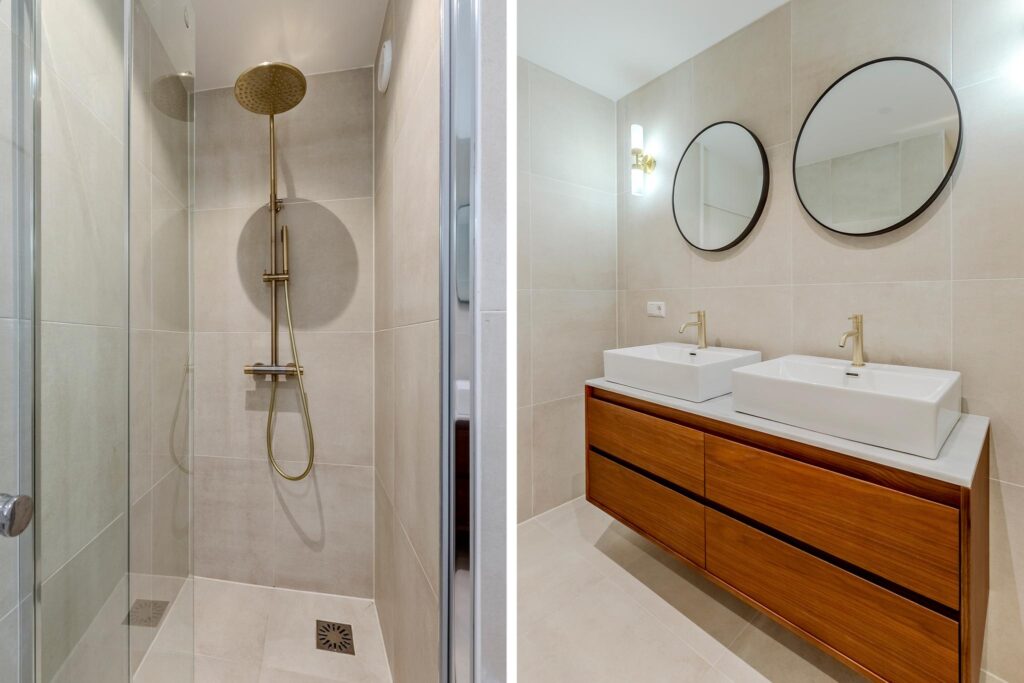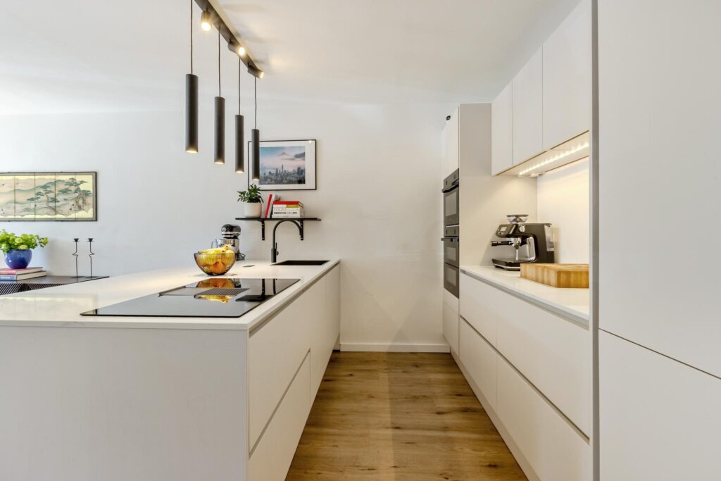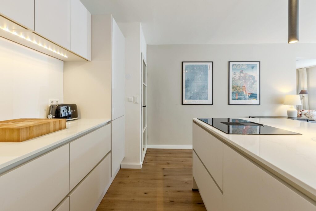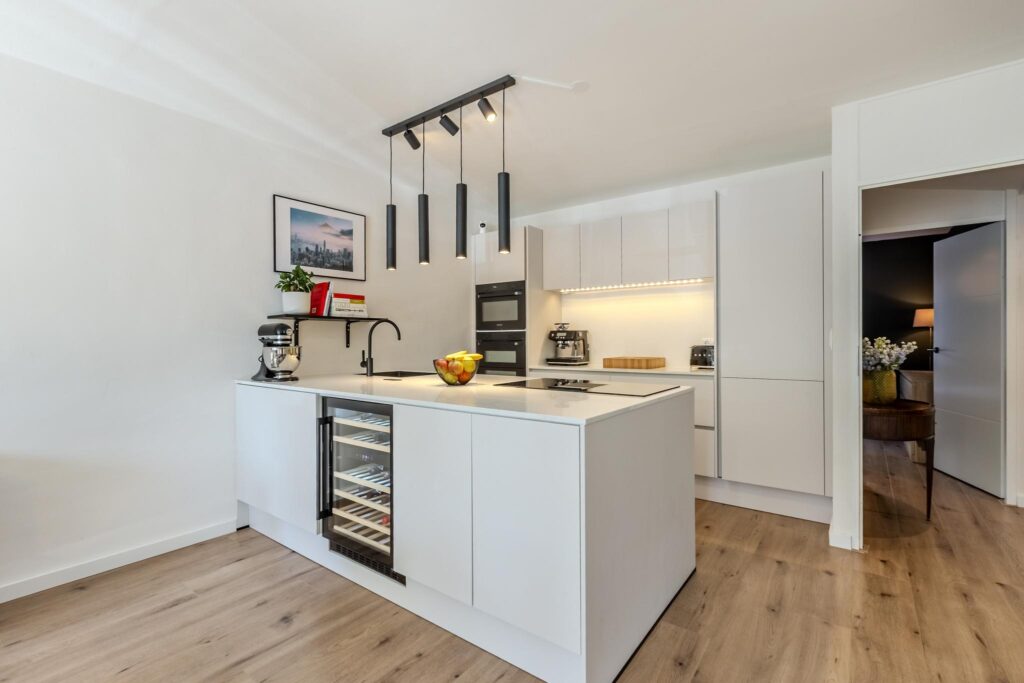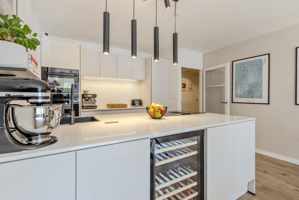 – luxe inbouwkeuken met kookschiereiland en luxe badkamer;
