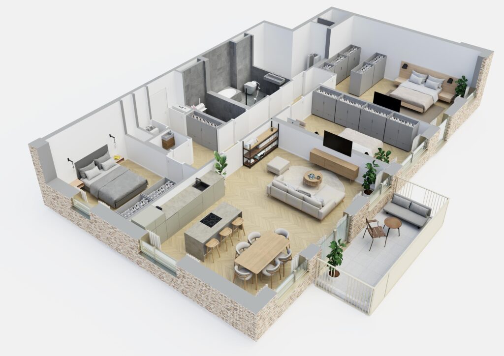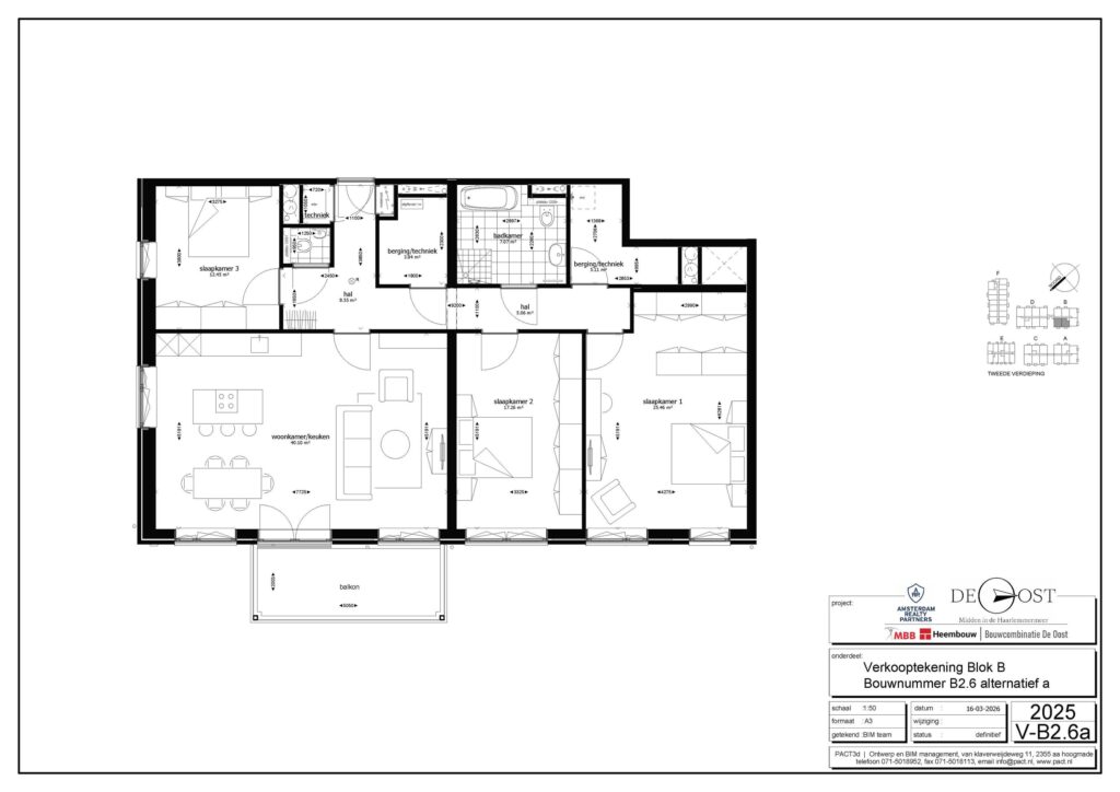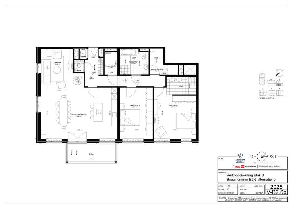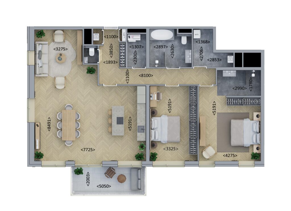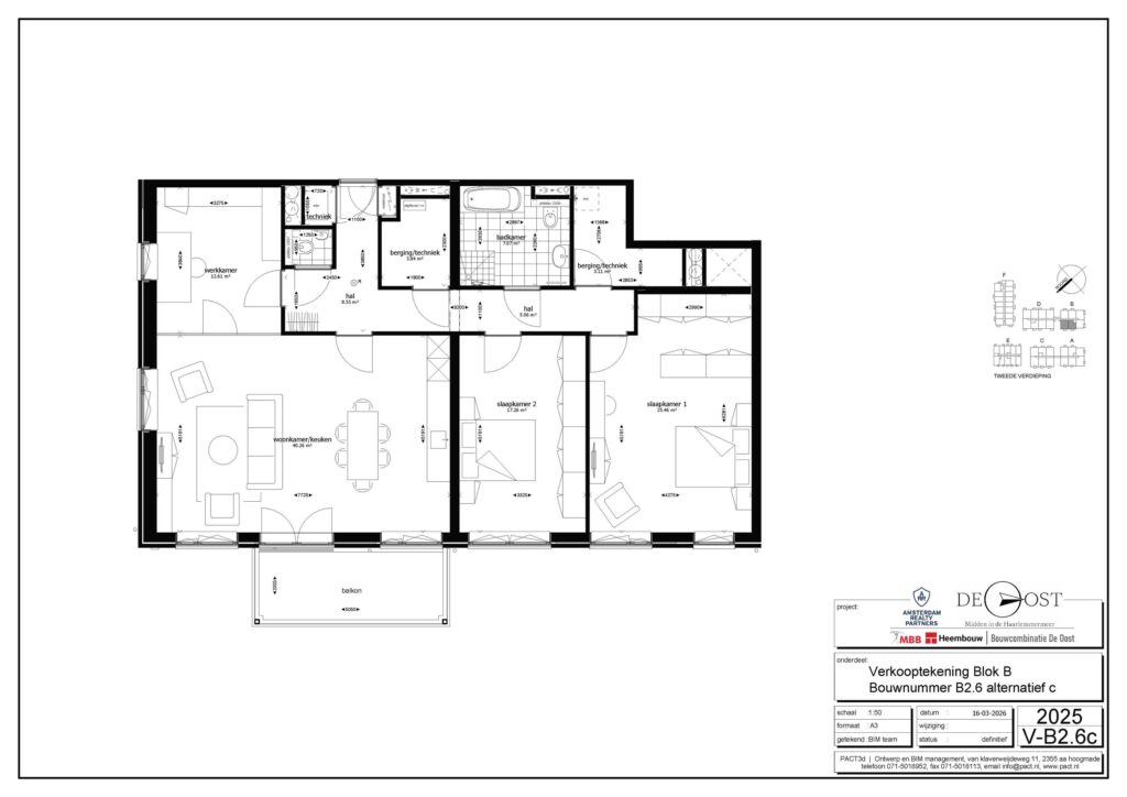 De woning beschikt over twee slaapkamers en biedt diverse indelingsopties, waaronder een derde slaapkamer. Door de ruime indeling ontstaat de vrijheid om de woning volledig naar wens in te richten. Verder is de badkamer is voorzien van een inloopdouche, wastafel en vloerverwarming. Daarnaast beschikt het appartement over een buitenruimte van circa 10 m².
