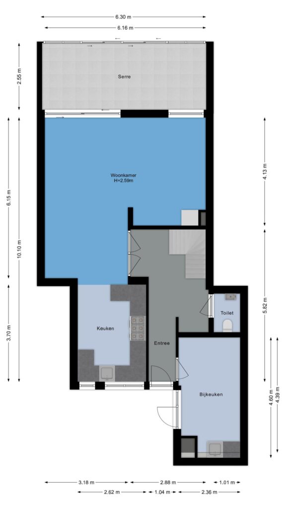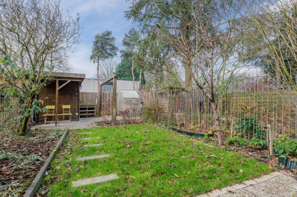 entree/ruime hal, hangend toilet met fontein, royale bijkeuken/berging met kitchenette en wasmachine aansluiting. Royale woonkamer met openhaard en toegang tot de serre middels schuifpui. Vanuit de serre heeft men toegang tot de zonnige achtertuin met achterom en berging. Half open inbouwkeuken aan de voorzijde van de woning voorzien van gaskookstel met oven, vlakscherm afzuiger, vaatwasser en een graniet aanrechtblad. De woonkamer en keuken zijn voorzien van een fraaie tegelvloer met vloerverwarming.