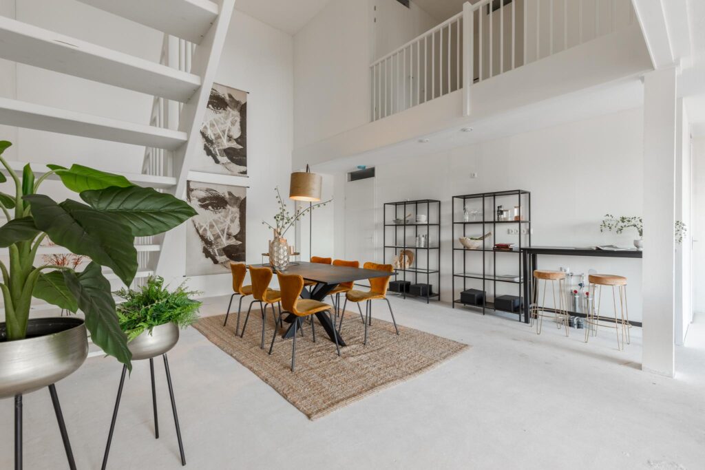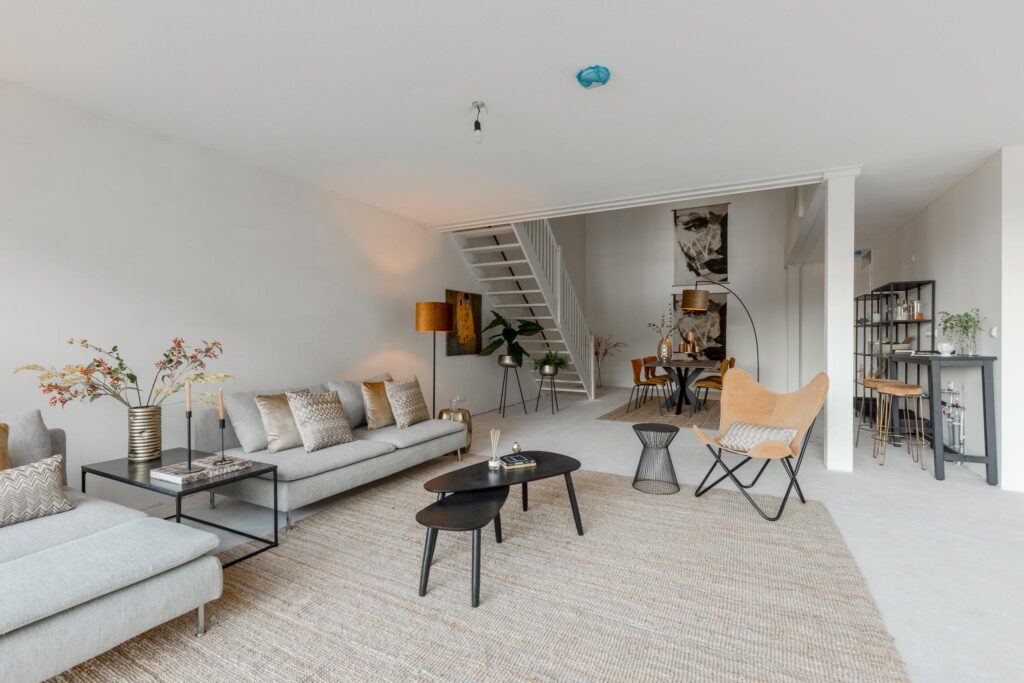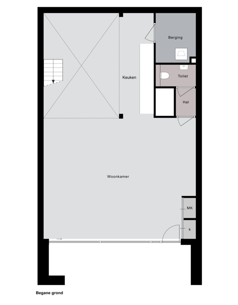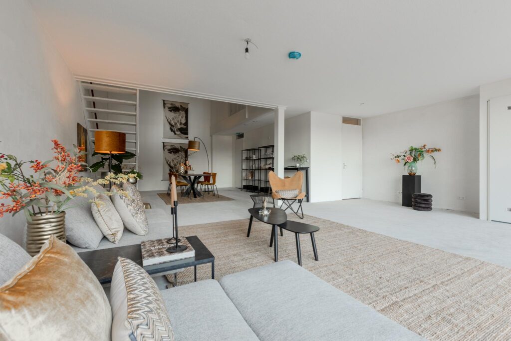 Begane grond: Directe toegang tot de ruime open leefruimte met hoge ramen en een schuifdeur naar het terras aan de voorzijde. De nog te plaatsen keuken bevindt zich achterin het appartement met een plafondhoogte van 4.20 meter en heeft een open trap naar boven. Een wc met voorportaal en een interne berging met wasmachineaansluiting zijn ook op deze verdieping te vinden.