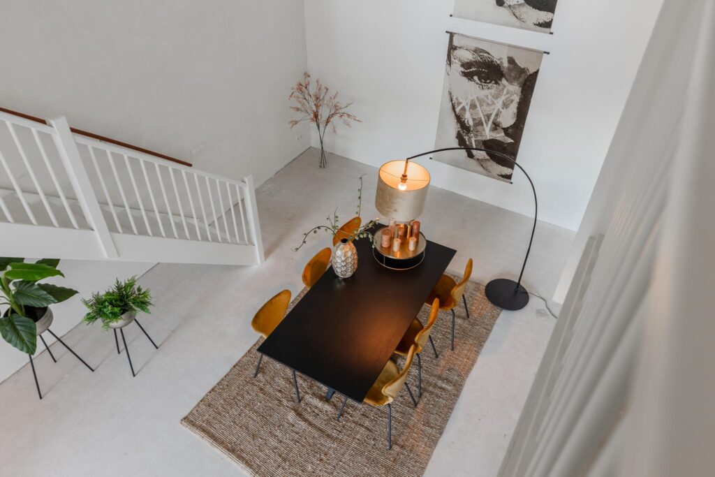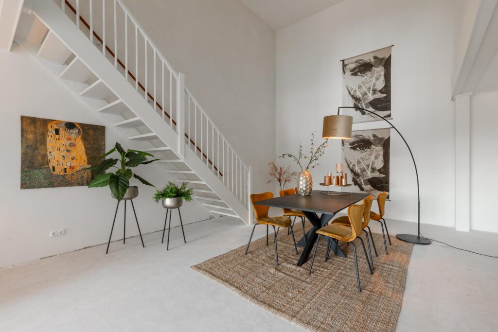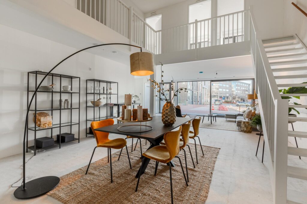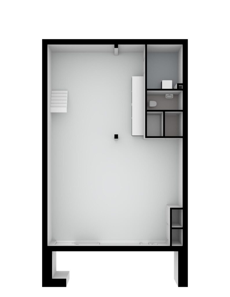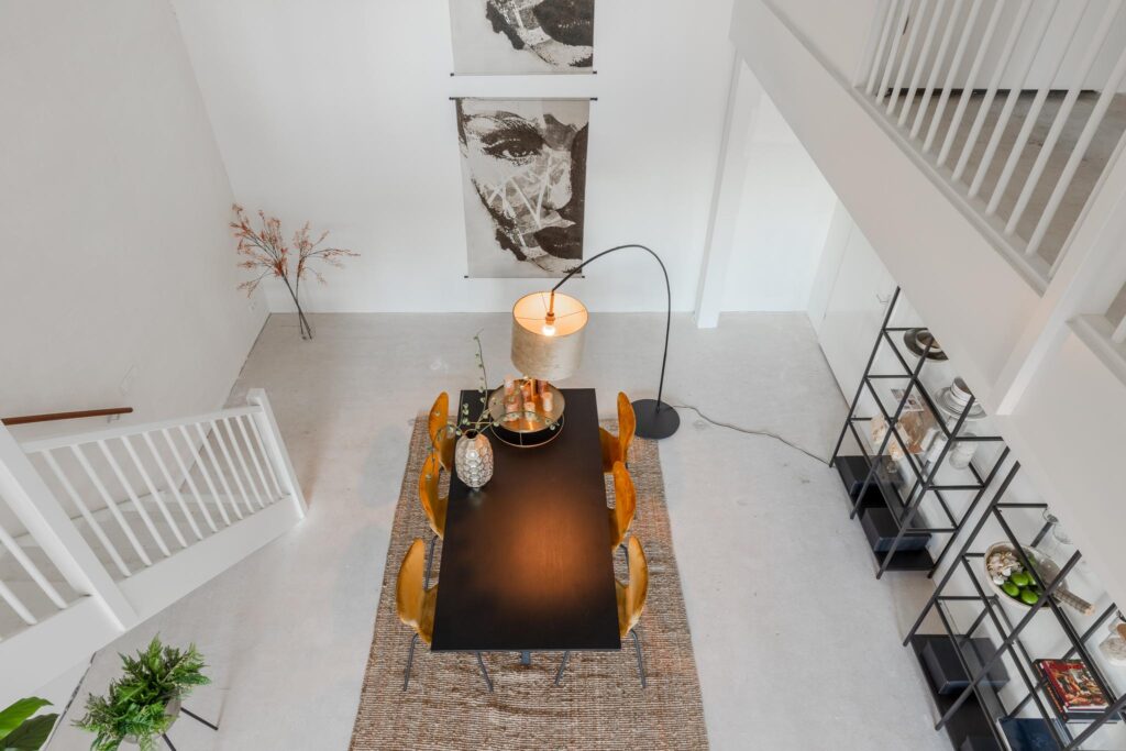 Begane grond: Directe toegang tot de ruime open leefruimte met hoge ramen en een schuifdeur naar het terras aan de voorzijde. De nog te plaatsen keuken bevindt zich achterin het appartement met een plafondhoogte van 4.20 meter en heeft een open trap naar boven. Een wc met voorportaal en een interne berging met wasmachineaansluiting zijn ook op deze verdieping te vinden.