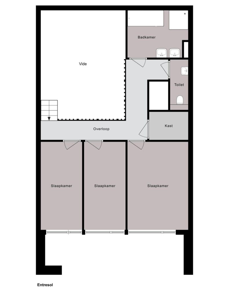 Entresol verdieping: Ruime overloop met toegang tot alle ruimtes. De drie slaapkamers bevinden zich aan de voorzijde, in het midden een tweede aparte wc met fonteintje en een berging. Aan de achterzijde is de badkamer met een ligbad, douche en dubbele wastafel.