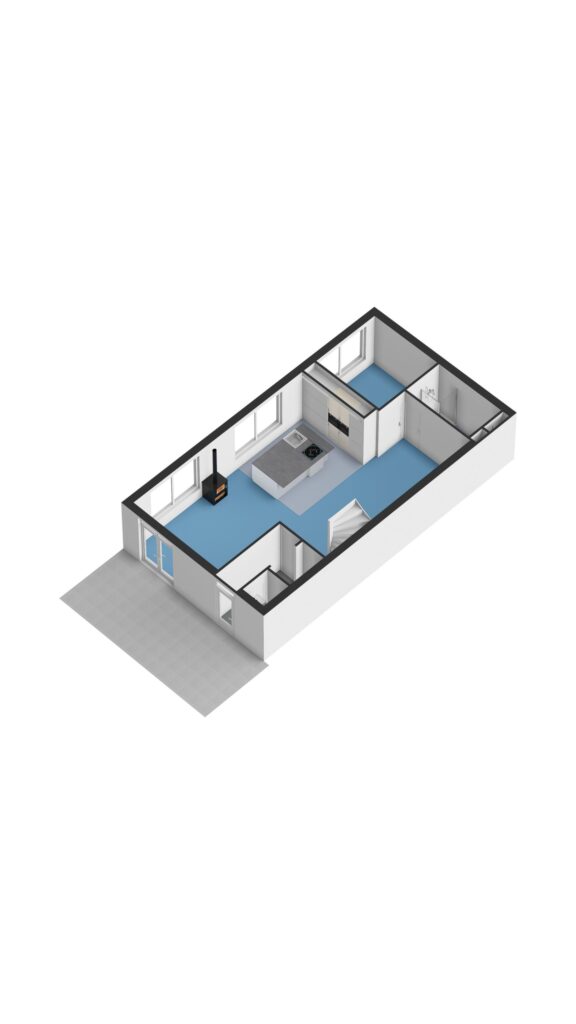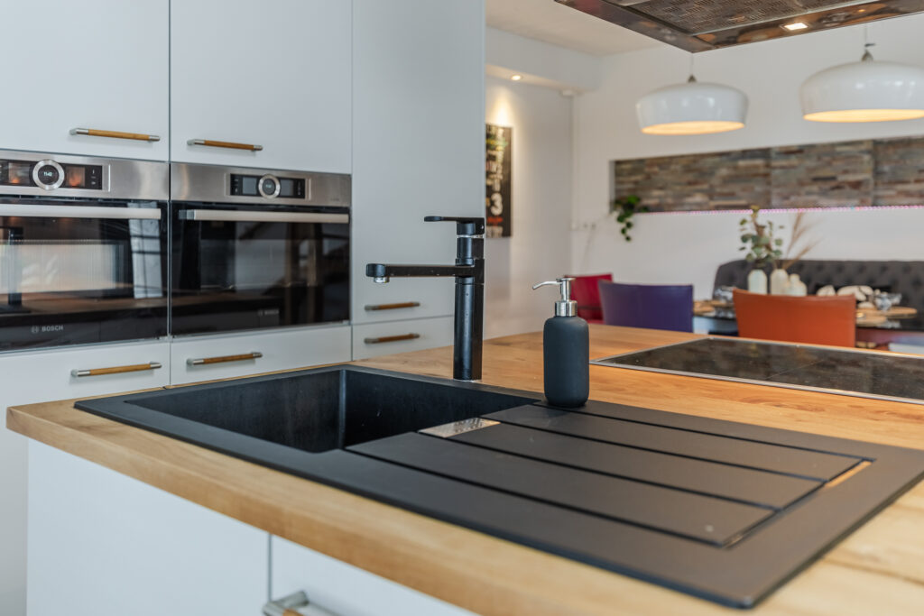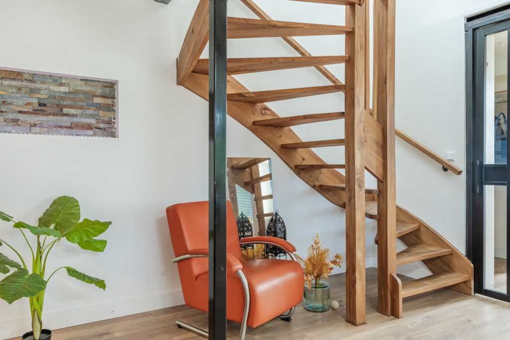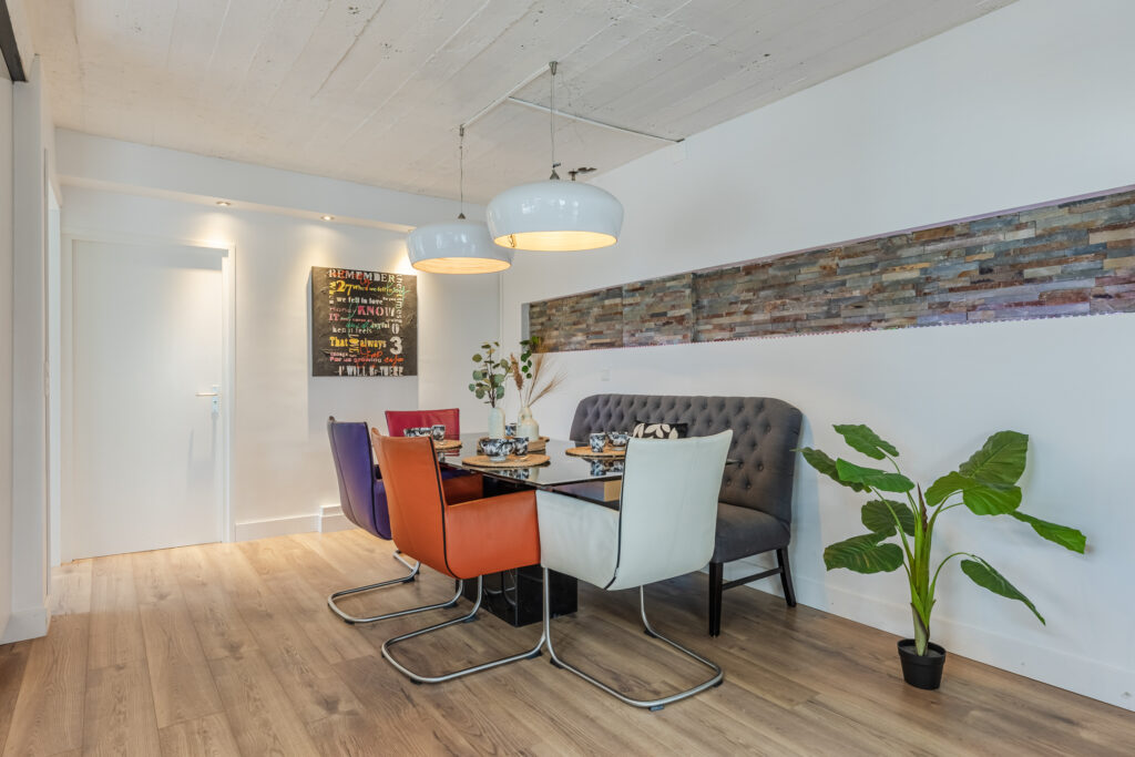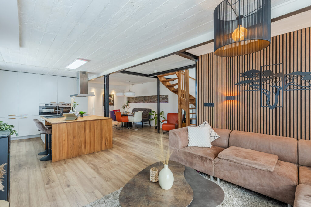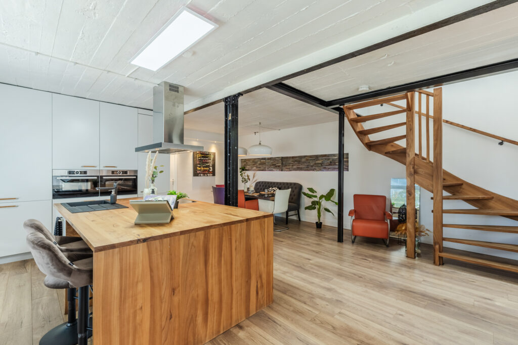 We enter the hallway, where we hang up our coats and where there is a cupboard for the central heating system. We then enter the very spacious living room. There is a kitchen with a cooking and washing-up island and a dining area where you can enjoy long meals with friends and family. The open kitchen is equipped with built-in appliances: two combination microwaves, a dishwasher, induction hob, sink, refrigerator, freezer and extractor hood. There is a cosy pellet stove where we can sit during the autumn days, but the sitting area also gives a cosy impression. You can also access the roof terrace from the sitting area. We find the first bathroom at the back of the house, which is equipped with a shower, toilet and washbasin. There is a separate bedroom on this floor, which now serves as a study/home office.