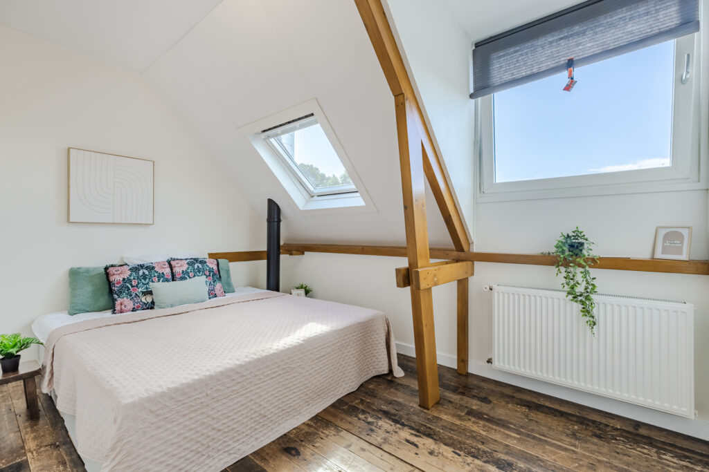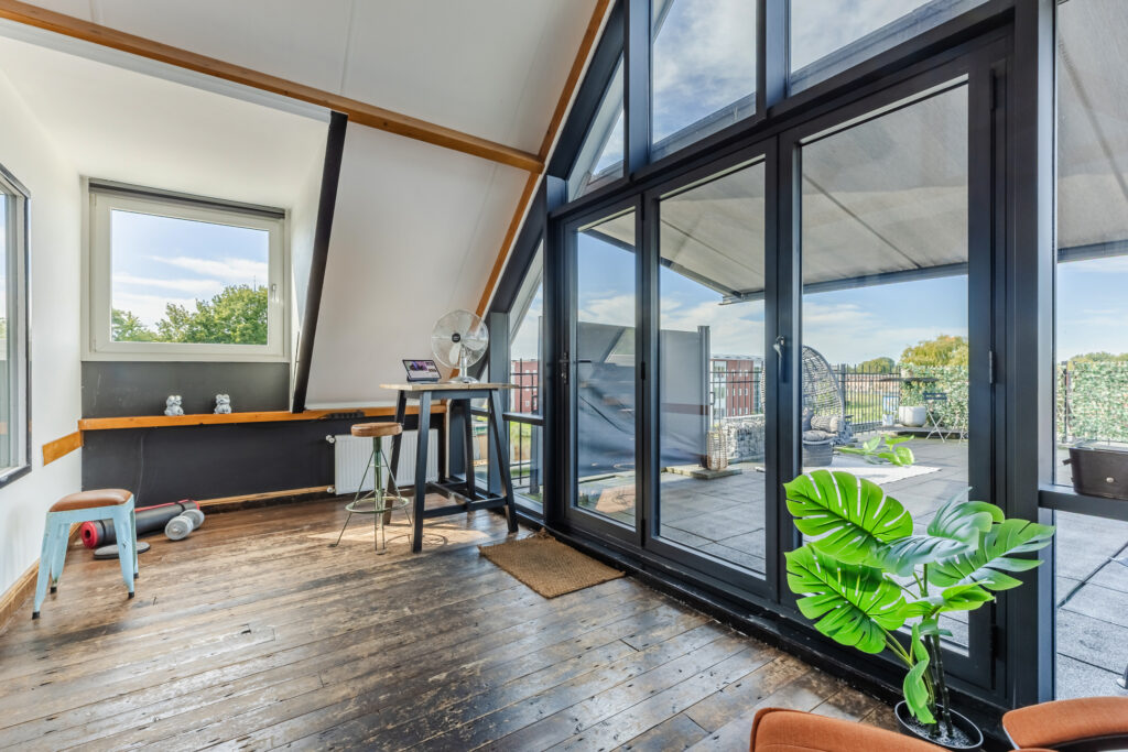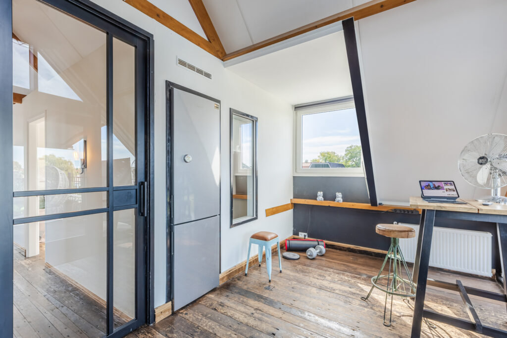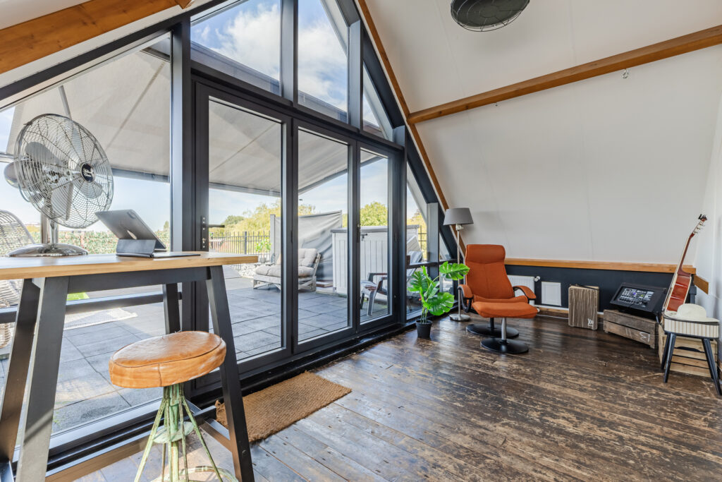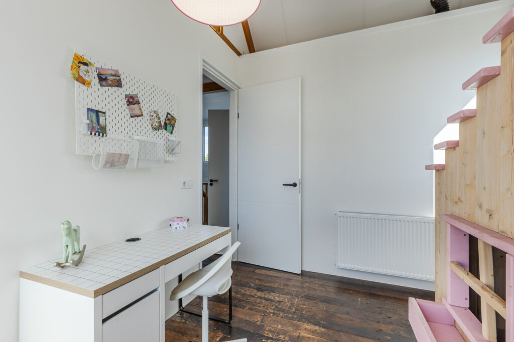 A staircase in the living room leads to the second floor, which was added to the house in 2020. The landing provides access to all the bedrooms and even a second bathroom. The bathroom has a bath, toilet, walk-in shower and double washbasin with vanity unit. There are no fewer than four bedrooms on this floor, all of which are spacious. The largest bedroom has a walk-in wardrobe and access to the very spacious roof terrace. There are beautiful window frames with HR glazing and high ceilings, which really give this room the wow factor. There are sun blinds for the hot days. The roof terrace faces west but offers sun all day long due to its large surface area. The roof terrace can be furnished as you wish and offers a beautiful view over the water.