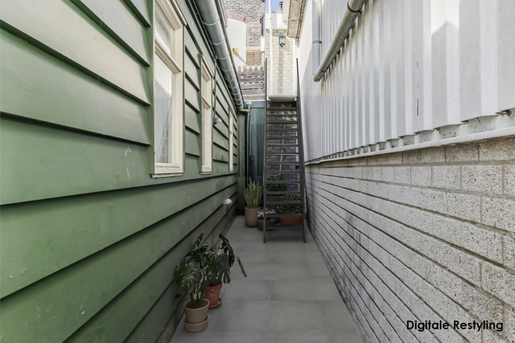 A large gate leads to the communal tiled front garden with space for letterboxes and bicycle storage. A staircase on the side of the building leads to the first floor, which is the entrance to the maisonette. A communal terrace in front of the door allows us to sit outside in the sun.