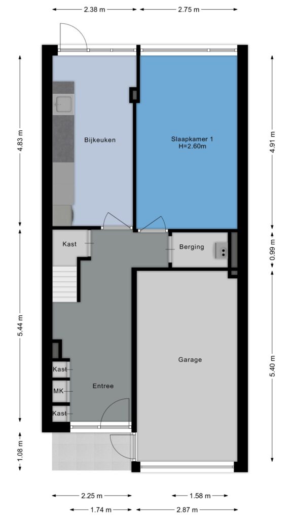 Entree met bergkast en bijkeuken. Hal met toilet, toegang tot de inpandige garage en 1 slaapkamer. Slaapkamers hebben toegang tot de fraai aangelegde tuin op het zuiden. Ideaal voor praktijk/kantoor aan huis, gastenverblijf of extra speelkamer.