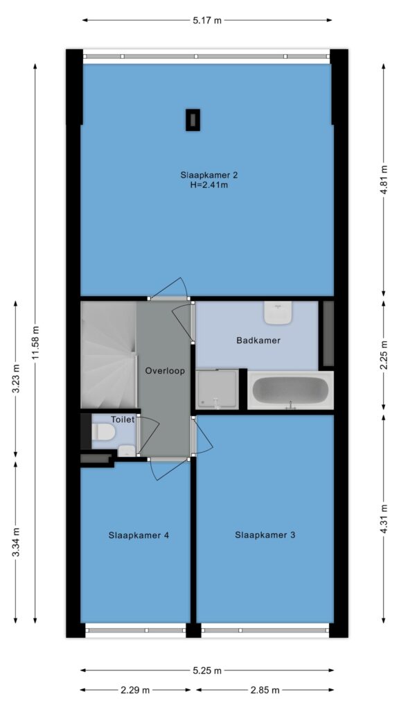 Overloop met toegang tot drie slaapkamers, waaronder een riante master bedroom. Twee slaapkamers die je kunt gebruiken als kinderkamers of studieruimtes. De nette badkamer is uitgerust met een inloopdouche, bad en wastafel. Op de overloop bevindt zich een separaat toilet.