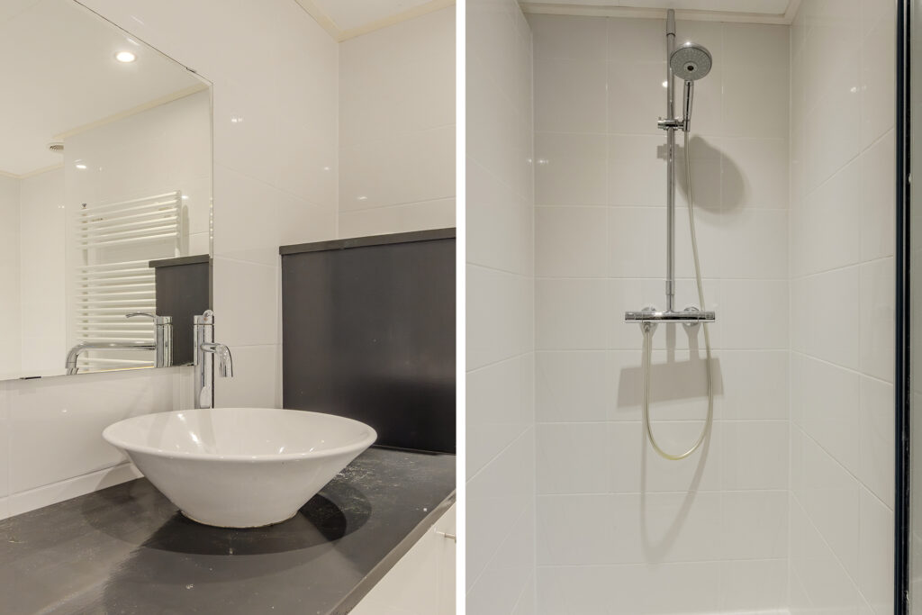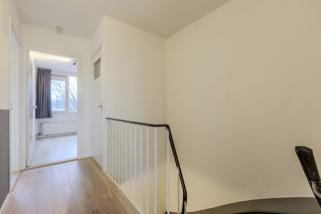 Overloop met toegang tot drie slaapkamers, waaronder een riante master bedroom. Twee slaapkamers die je kunt gebruiken als kinderkamers of studieruimtes. De nette badkamer is uitgerust met een inloopdouche, bad en wastafel. Op de overloop bevindt zich een separaat toilet.