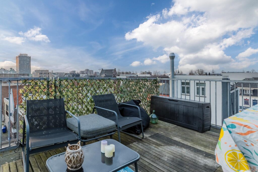 Vanuit de gemeenschappelijke hal heb je toegang middels een Amsterdamse trap tot het zeer ruime dakterras.