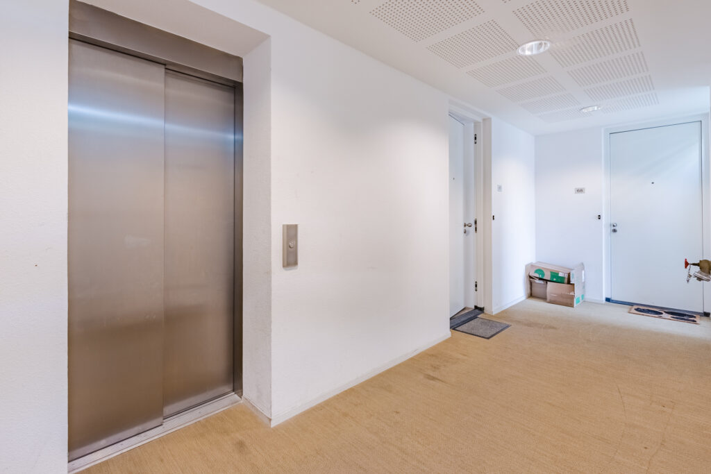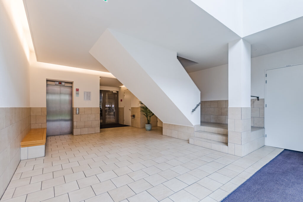 Central, enclosed entrance with intercom/videophone system, mailboxes, elevator, stairwell, and access to the private storage unit and private parking space in the parking garage.