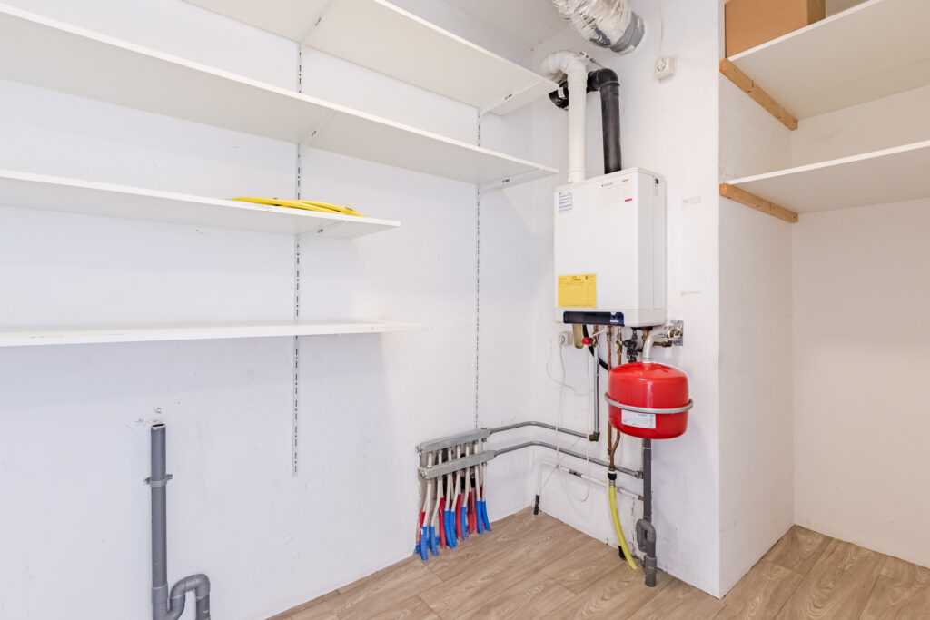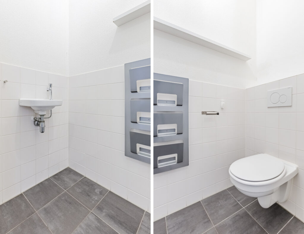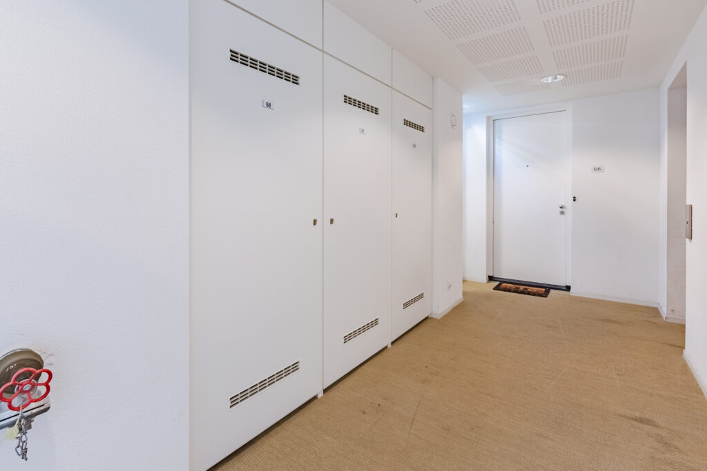 The two spacious bedrooms are located on the quiet courtyard side of the home and also provide access to the balcony. The bathroom is spacious, fully tiled, and features a vanity sink, walk-in shower, and toilet. Additionally, there is a second separate toilet with a hand basin, as well as a practical storage room with connections for the washer and dryer, the mechanical ventilation unit, and the central heating boiler.
