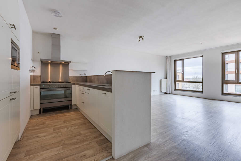 Entree, ruime hal met toegang tot tot alle vertrekken. De royale woonkamer is dankzij de vele raampartijen bijzonder licht en ruimtelijk. De woonkamer is gelegen aan de achterzijde van het complex en biedt toegang tot het fijne ruime balkon met uitzicht op de binnentuin. Het balkon is gelegen op het westen, waardoor je hier heerlijk kunt genieten van de middag- en avondzon. De open keuken is modern en uitgerust met diverse inbouwapparatuur, waaronder een 6-pits gasfornuis met oven, RVS-afzuigkap, magnetron, vaatwasser en koel-/vriescombinatie.