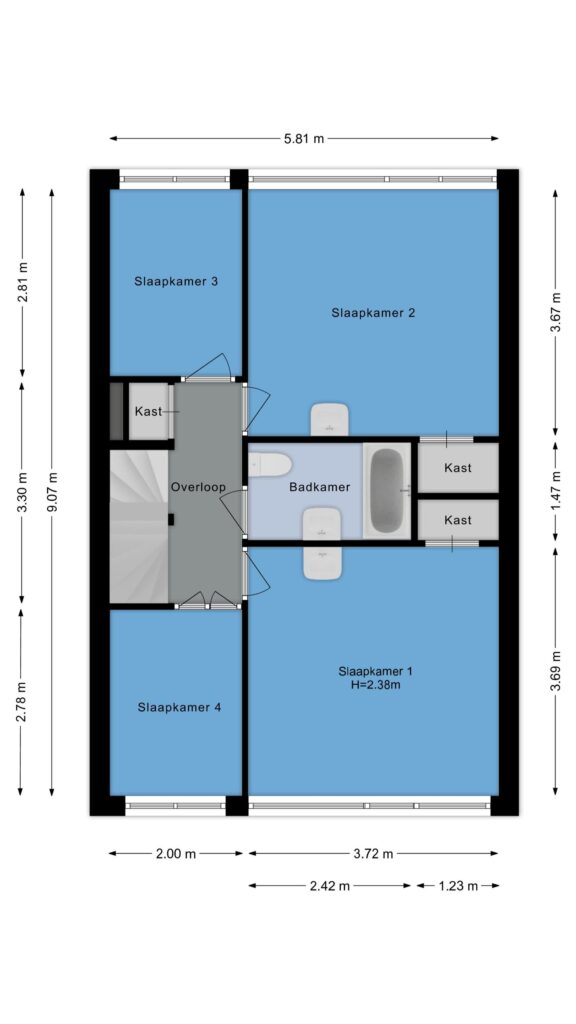 Overloop met toegang tot vier slaapkamers (twee grote en twee kleinere kamers) en de badkamer. De grotere slaapkamers beschikken over vaste kasten. De centraal gelegen badkamer is voorzien van een ligbad annex douche, wastafel en toilet.