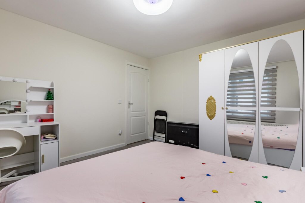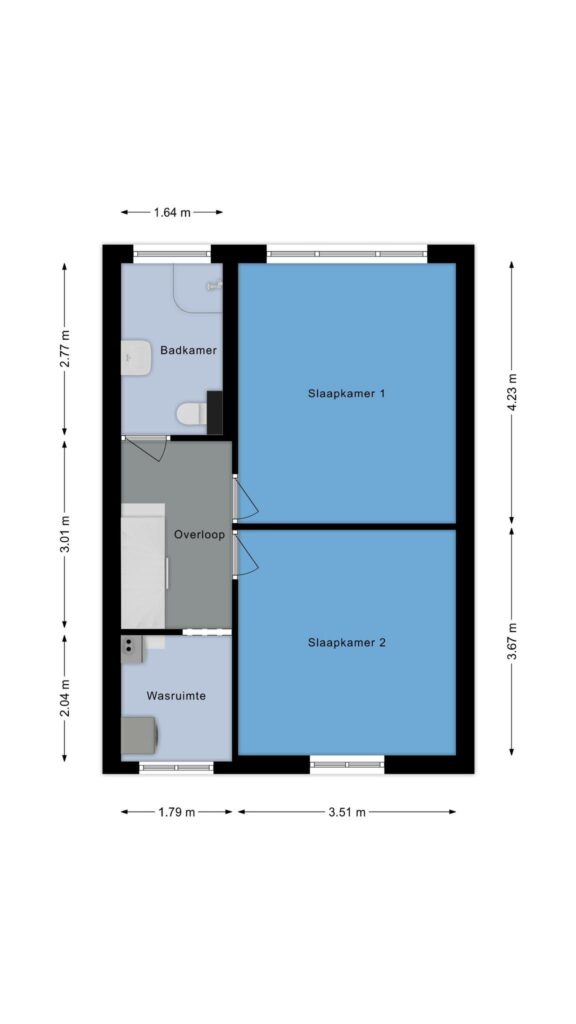 Terug in de woning op de eerste verdieping heb je de beschikking over 2 royale slaapkamers, de nette badkamer en een praktische wasruimte. De badkamer is voorzien van een wastafel met meubel, toilet en inloopdouche met stortdouche. De praktische wasruimte is voorzien van de aansluiting voor de wasmachine en drogeropstelling en van de cv-ketel installatie.