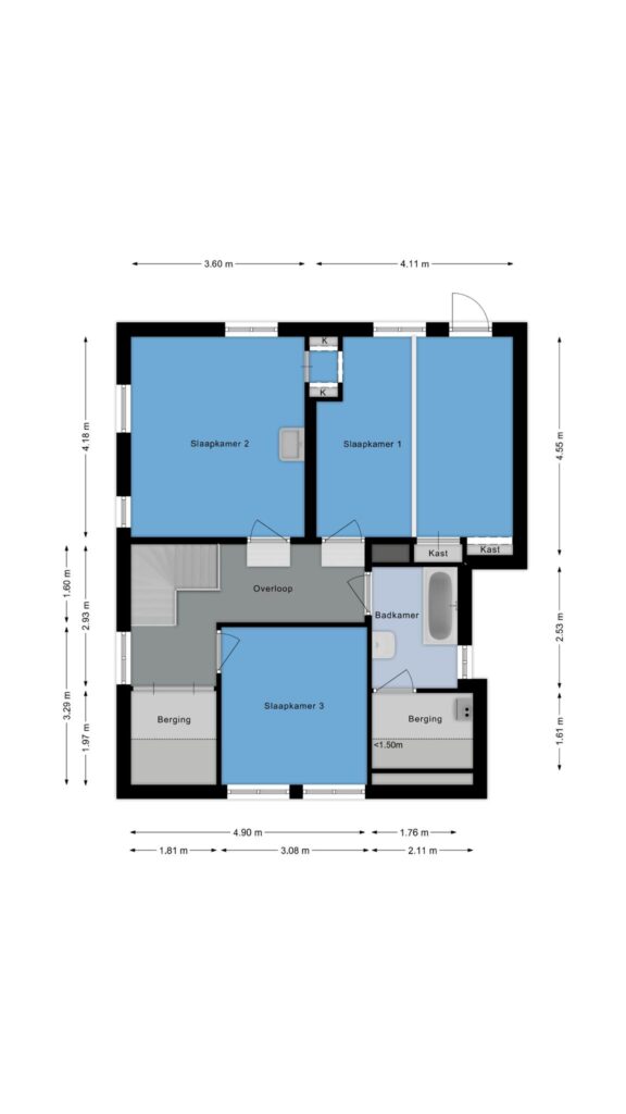 Op de eerste verdieping heb je de beschikking over een ruime berging en 3 royale slaapkamers, waarvan twee met vaste kasten. De badkamer is voorzien van een wastafel en bad. Vanuit de badkamer heb je toegang tot een berging waar zicht de cv-ketel installatie zicht bevindt. De woning is aan de voorzijde voorzien van een dakkapel.