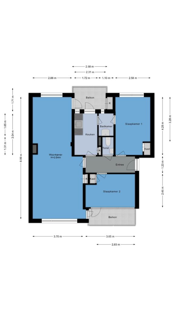 Entree/hal, toilet met fontein, ruime en lichte woonkamer met toegang tot beide balkons. Dichte eenvoudige keuken met mede toegang tot het balkon en badkamer met lavet. 2 ruime (slaap-) kamers met beide vaste kasten en 1 kamer met toegang tot het balkon.
